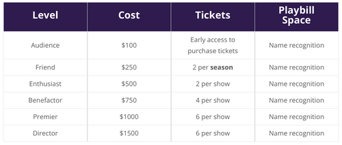 *Tickets are for fall, elementary Christmas, winter and spring productions, when applicable. Dinner Theatre seating subject to additional meal charges. Season and show opportunities subject to change.